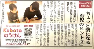 こんにちは、Kubotaのうけん・アタマGYM秦野教室です。 本日2/20発行のタウンニュース秦野版に記事を掲載していただきました 今回のテーマは「もっと楽になる育児のヒント②」 今回は、日常の“ことばのかけ方”について […]