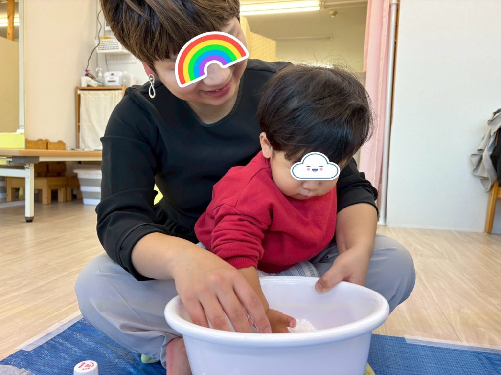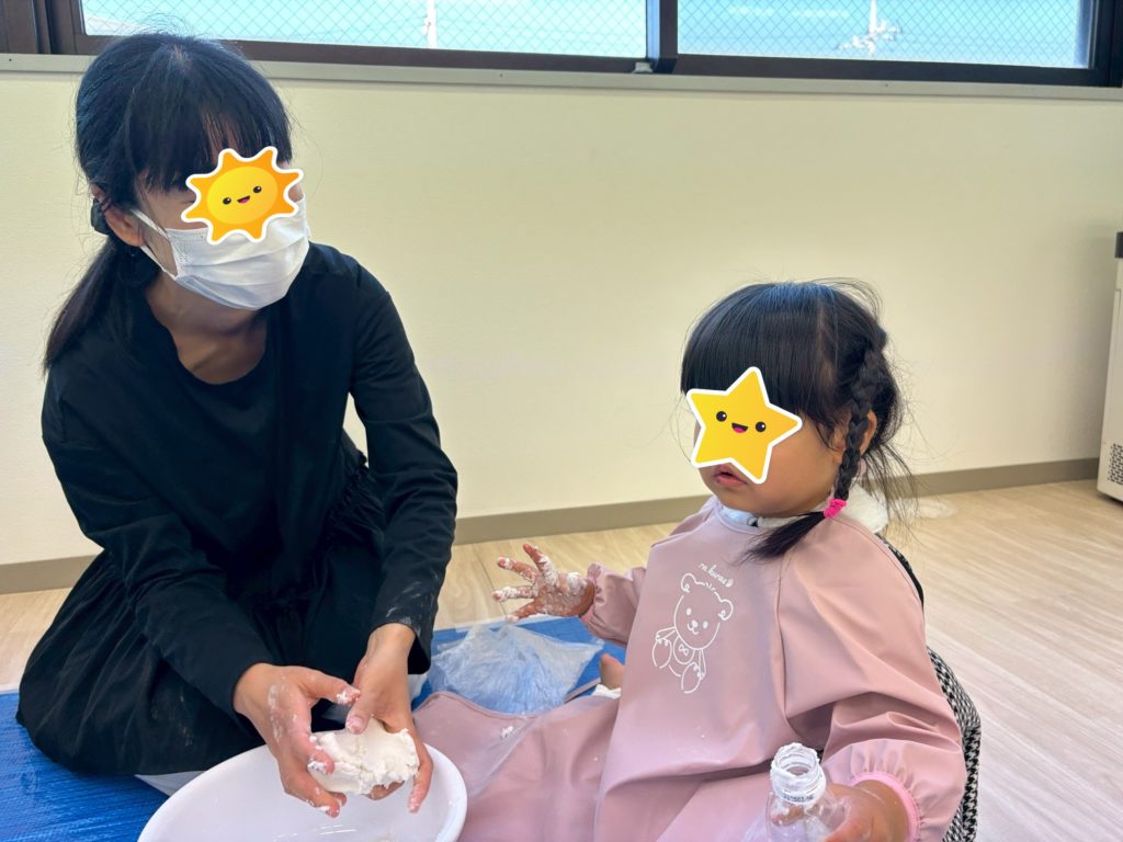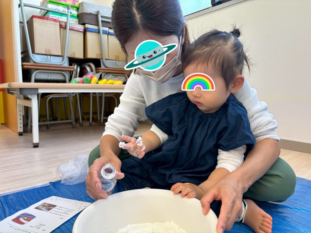 サラサラ・ドロドロ・もちもちなど、いろんな触感を感じながら自由にあそぶ時間を親子でたっぷり楽しみました!