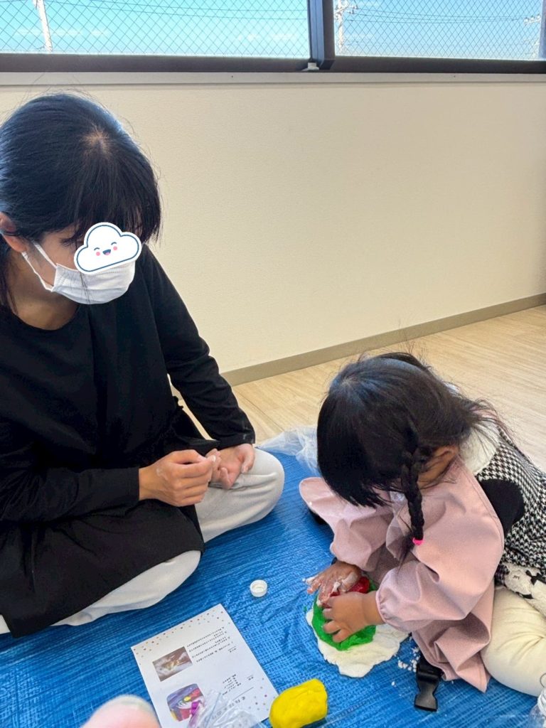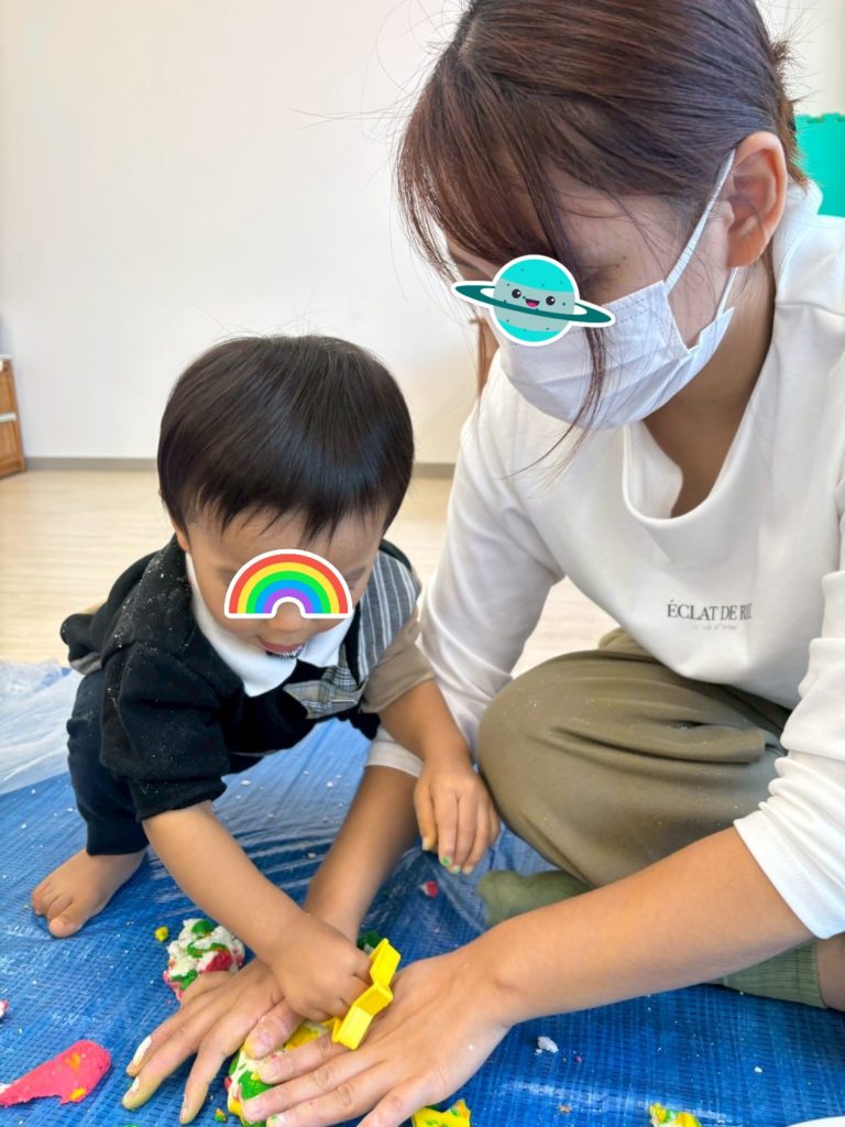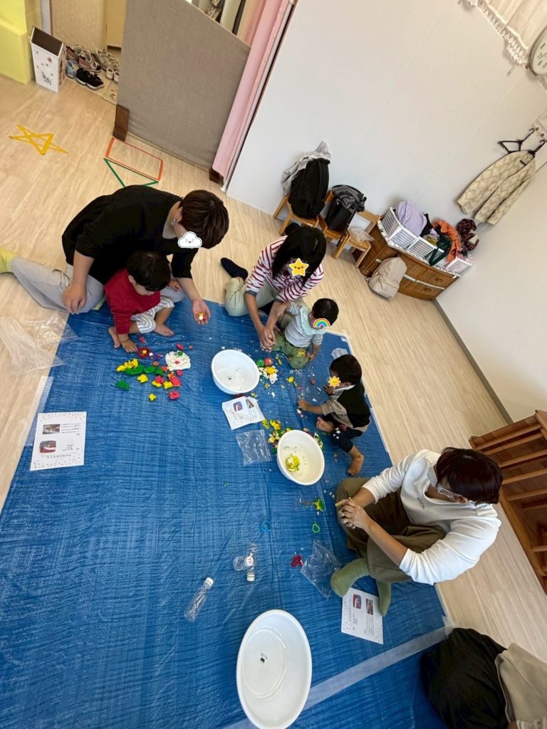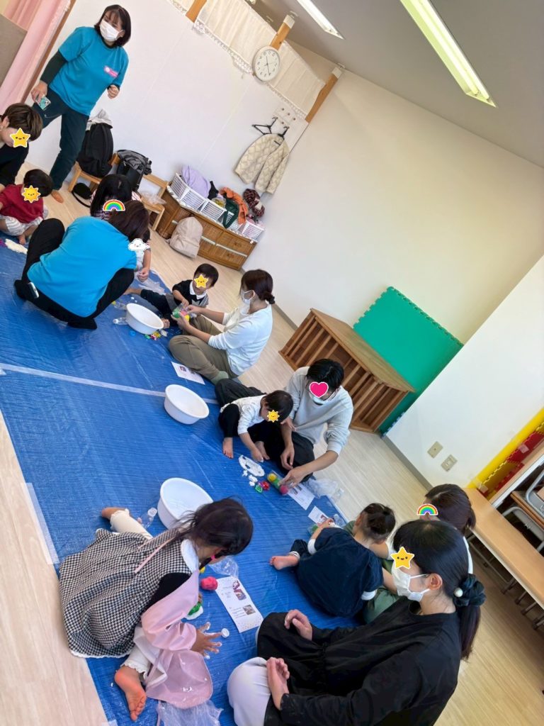 最初は触るのを嫌がっていたお子さんも、ママやお友だちが楽しそうに遊んでいるのを見て、「やってみようかな」と触りに来て、その後は夢中になって遊んでいました(*^_^*)