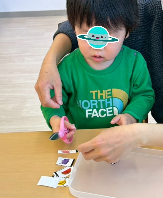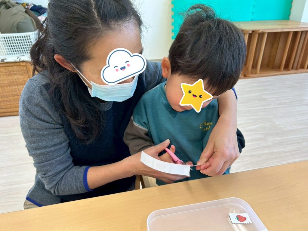 はじめは大人が手を添えて「いっしょにチョキン」。