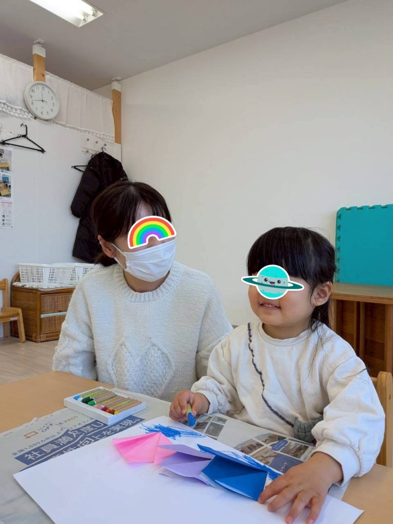 折り紙を折って、画用紙に貼り、クレヨンで色塗りをしました。