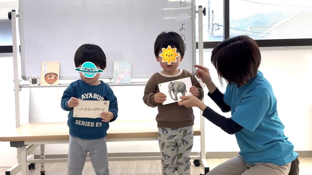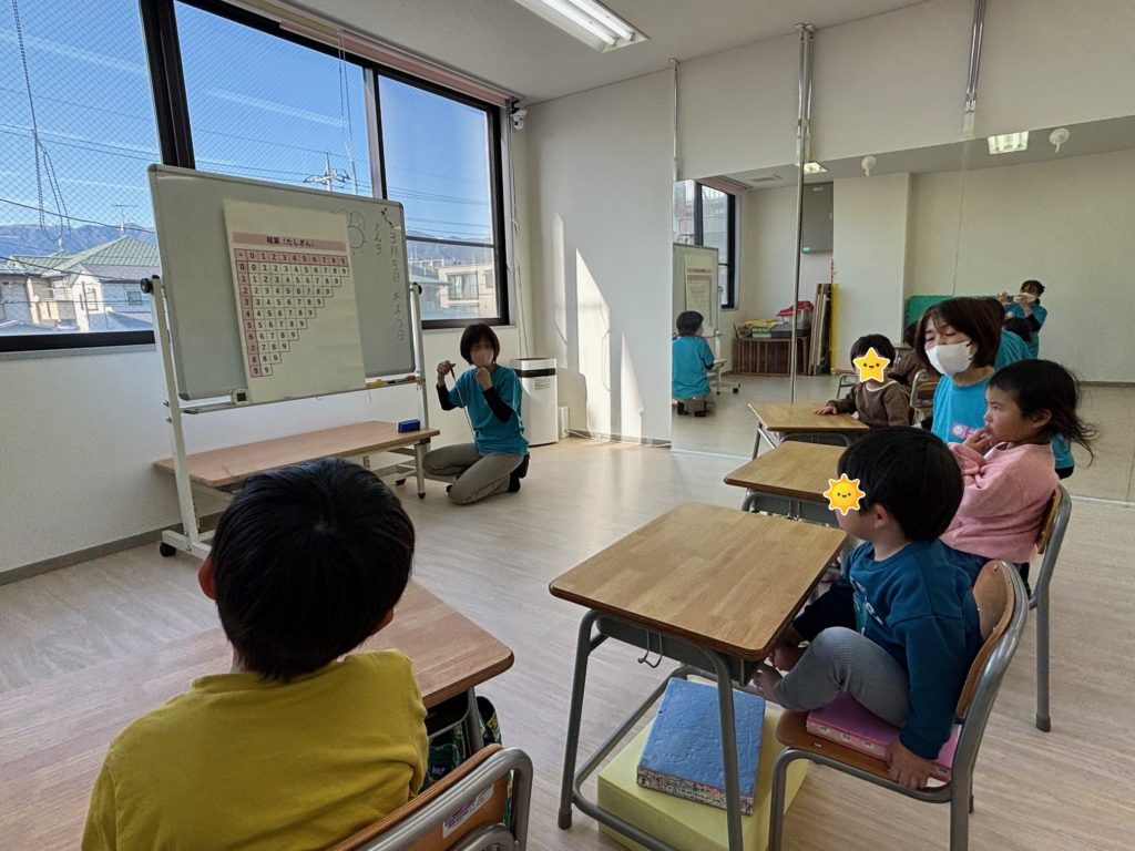 緊張した様子でしたが、お兄さん・お姉さんたちが取り組んでいる様子を見たり、座って先生のお話を聞いたり、とても頑張っていました。